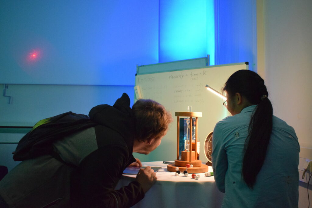(November 03, 2022) AOT-TP was present at the Schnupperuni on October 31, 2022 where pupils had the chance to attend their first lectures and get an idea on research at universities. For AOT-TP, Frances Lenahan, Francisco Bioucas and Thomas M. Koller showed our capillary viscometers for the measurement of viscosity and tried to explain the underlying phenomenon to the interested pupils.