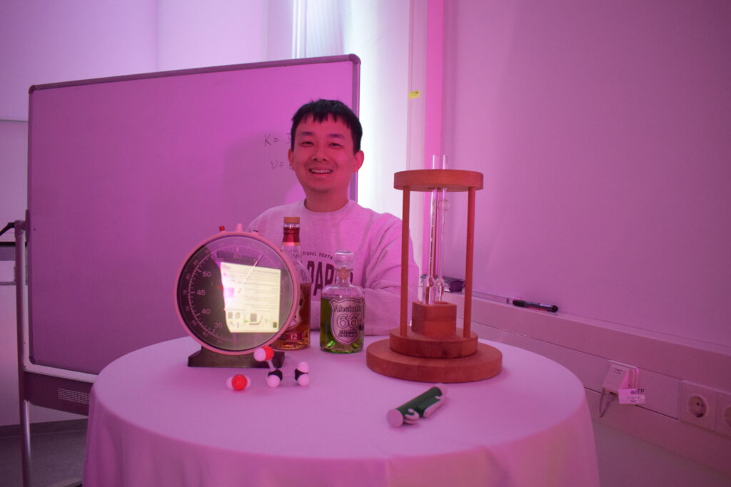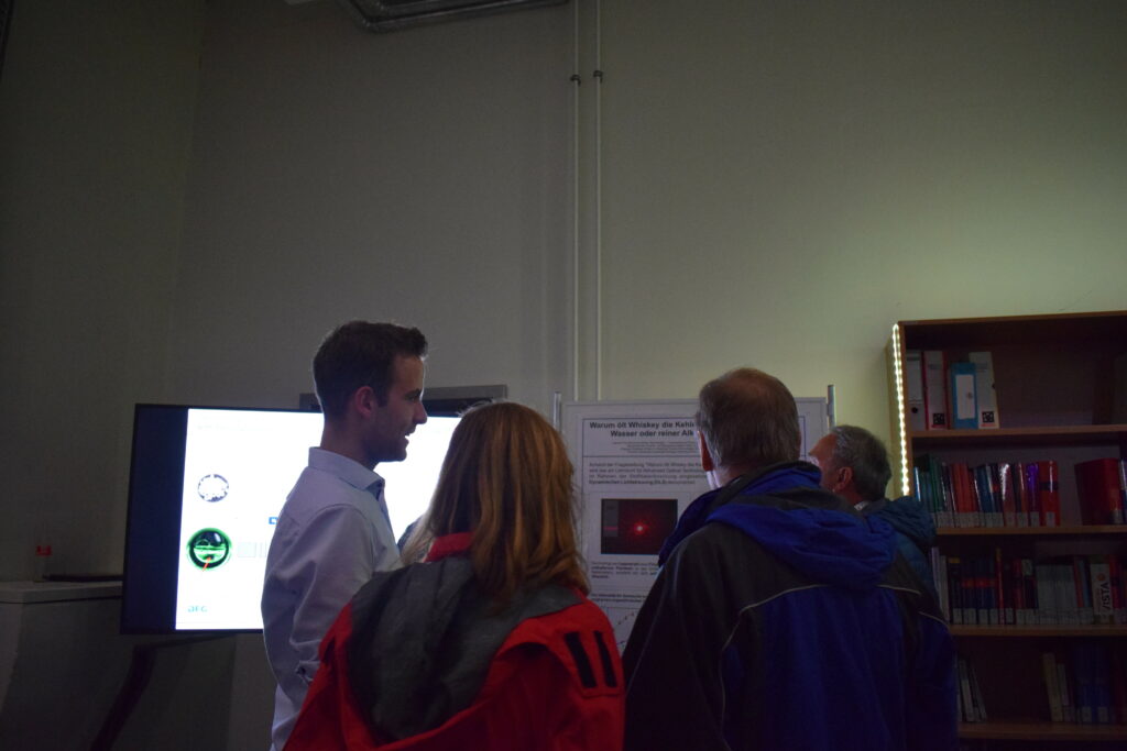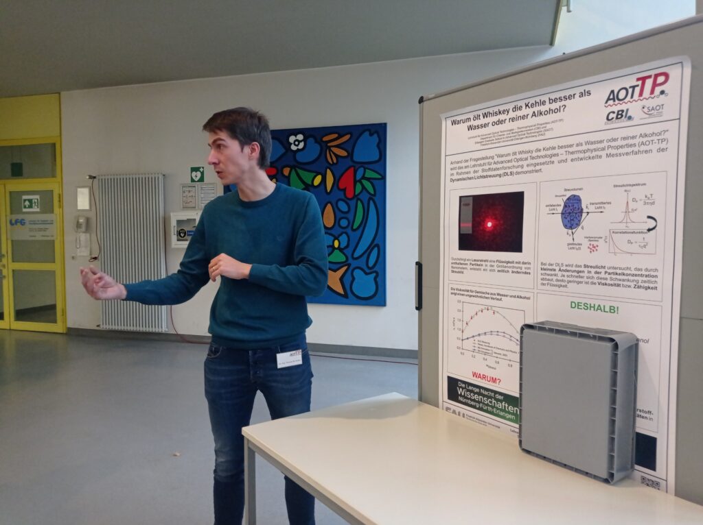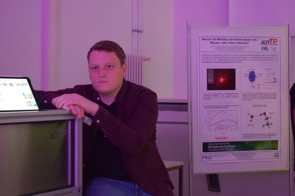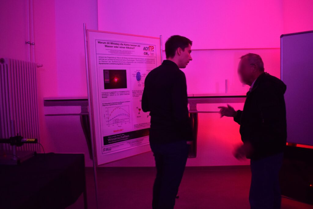 (May 30, 2022) On the occasion of the Lange Nacht der Wissenschaften 2022, the team of AOT-TP explained by means of viscosity measurements based on dynamic light scattering (DLS) experiments why whisky lubricates the throat better than pure water or pure alcohol.