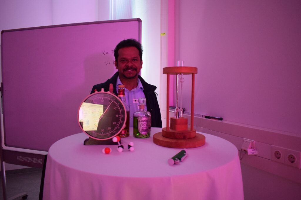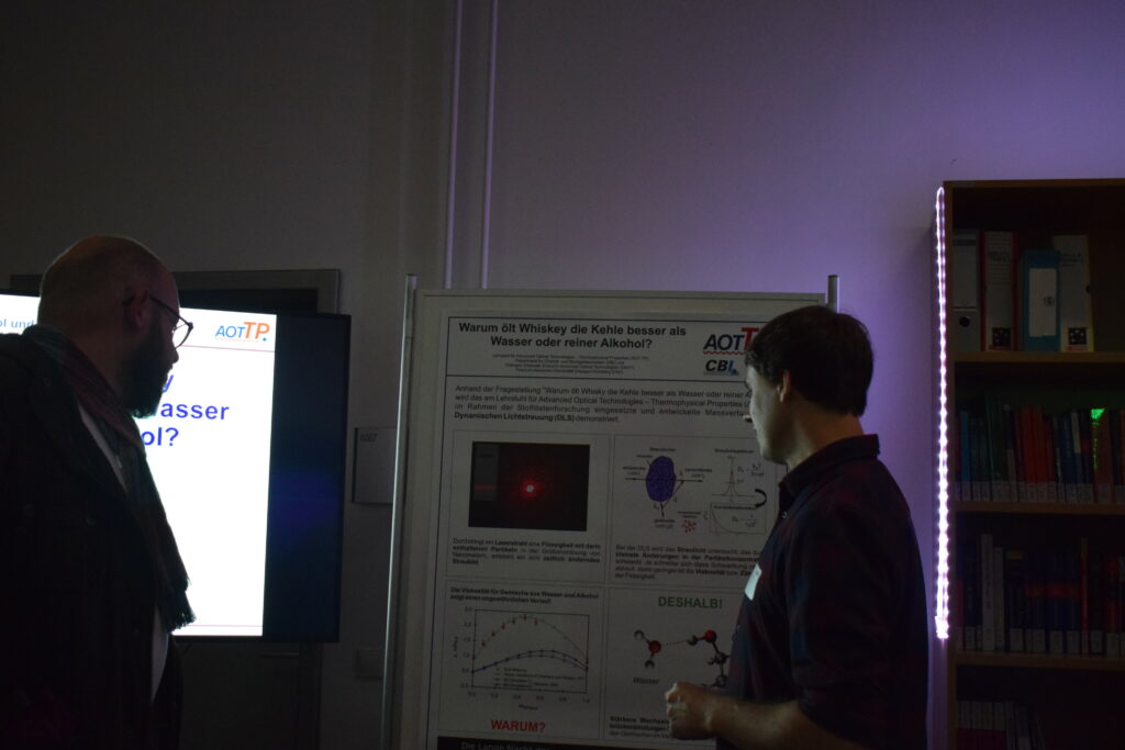 (October 25, 2025) On the occasion of the Nacht der Wissenschaften 2025, the team of AOT-TP has shown live experiments to answer the question why whisky lubricates the throat better than pure water or pure alcohol. Capillary viscometry and dynamic light scattering (DLS) experiments realized and used at AOT-TP were employed to measure the viscosity of mixtures of water and alcohol. More than 600 visitors used the opportunity to get an insight into thermophyiscal property research at AOT-TP and learn about the interesting behaviour of water-alcohol-mixtures. Thanks to all institute members who have contributed! The photos given below give an impression of this beautiful event.