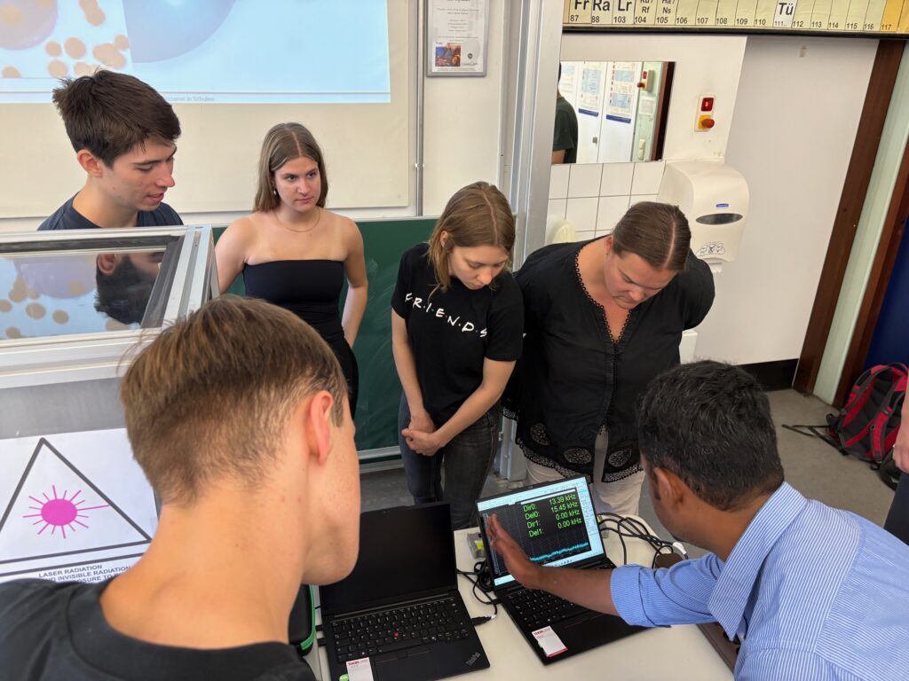 (December 17, 2018) AOT-TP was present at the Schnupperuni on October 31, 2018 where pupils had the chance to attend their first lectures and get an idea on research at universities. For AOT-TP, Maximilian Piszko and Thomas M. Koller showed our DLS setup for the measurement of viscosity via particle scattering and tried to explain the phenomenon of viscosity to the interested pupils.