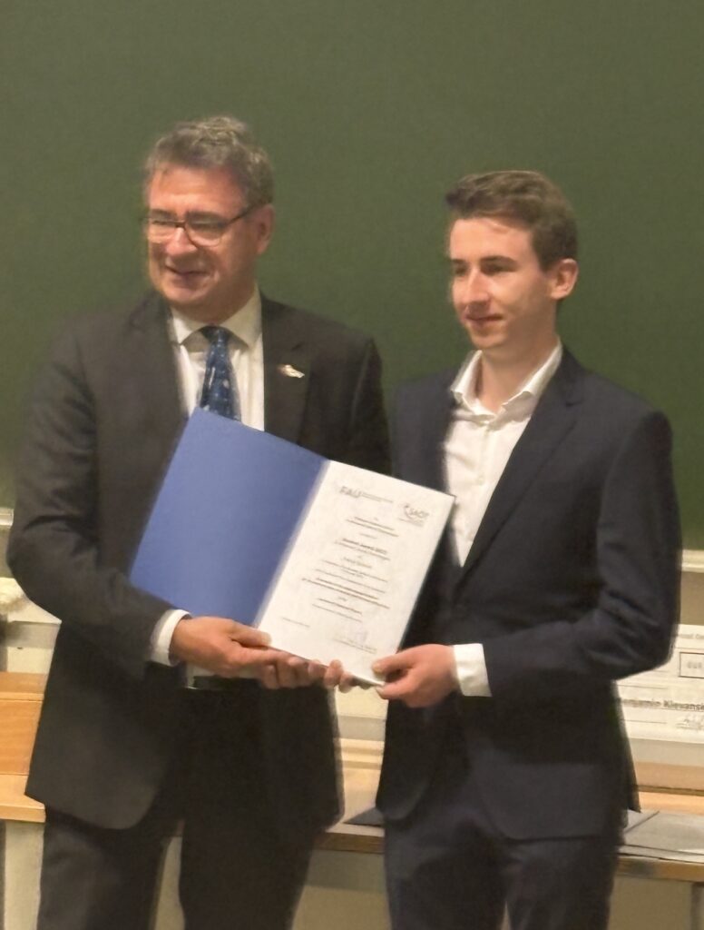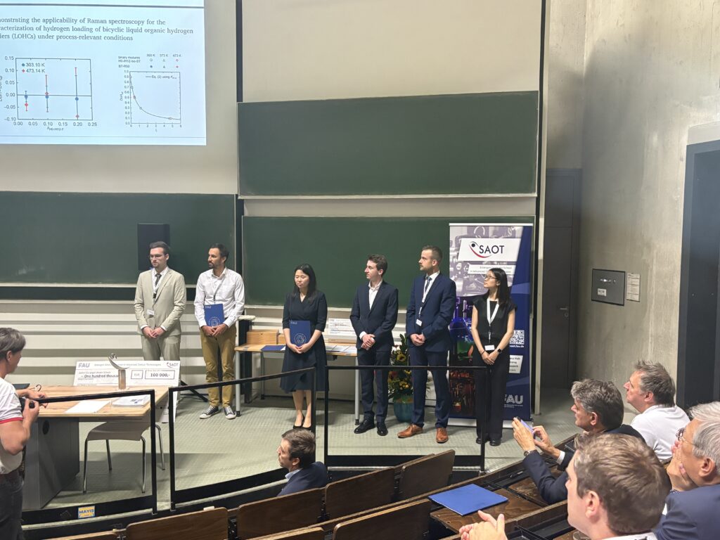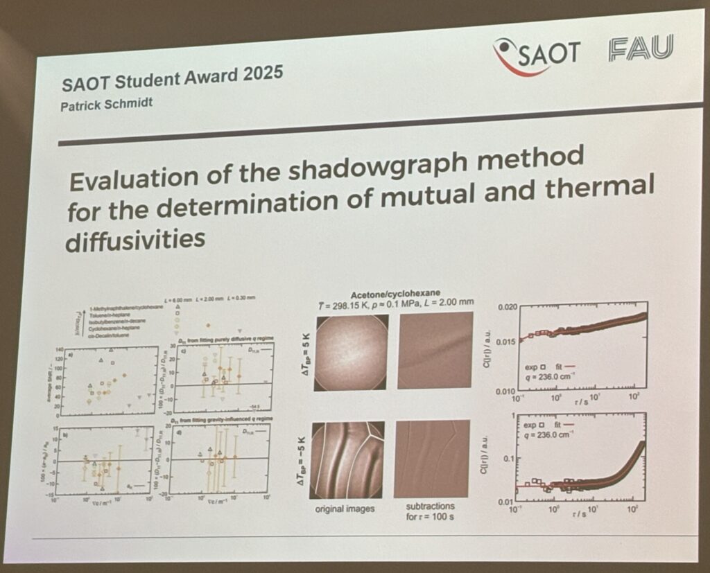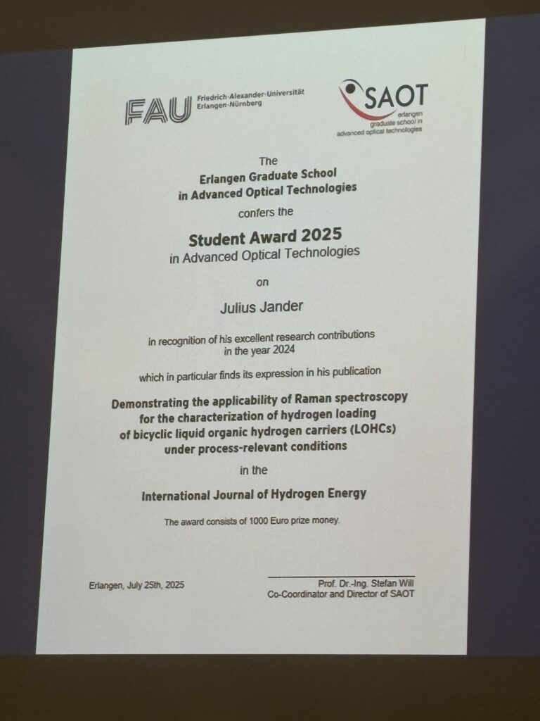 - Two out of the six SAOT Student Awards 2025 were presented to Patrick S. Schmidt and Julius H. Jander, acknowledging their first authorships of the high-ranked publications “Evaluation of the Shadowgraph Method for the Determination of Mutual and Thermal Diffusivities” and “Demonstrating the Applicability of Raman Spectroscopy for the Characterization of Hydrogen Loading of Bicyclic Liquid Organic Hydrogen Carriers (LOHCs) under Process-Relevant Conditions”.