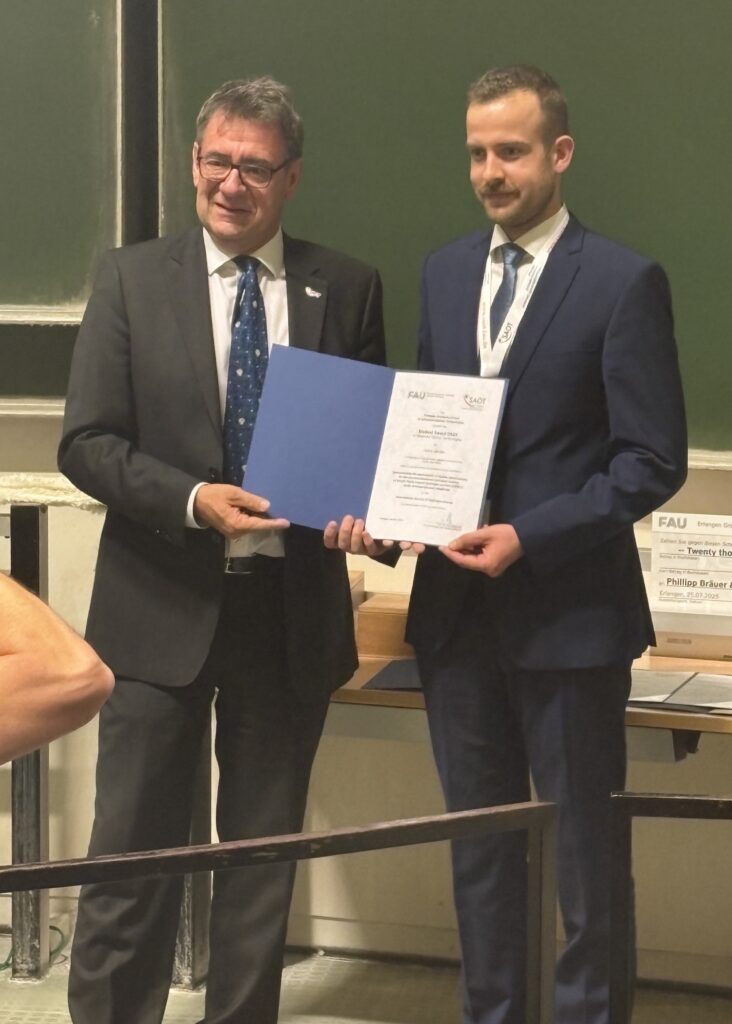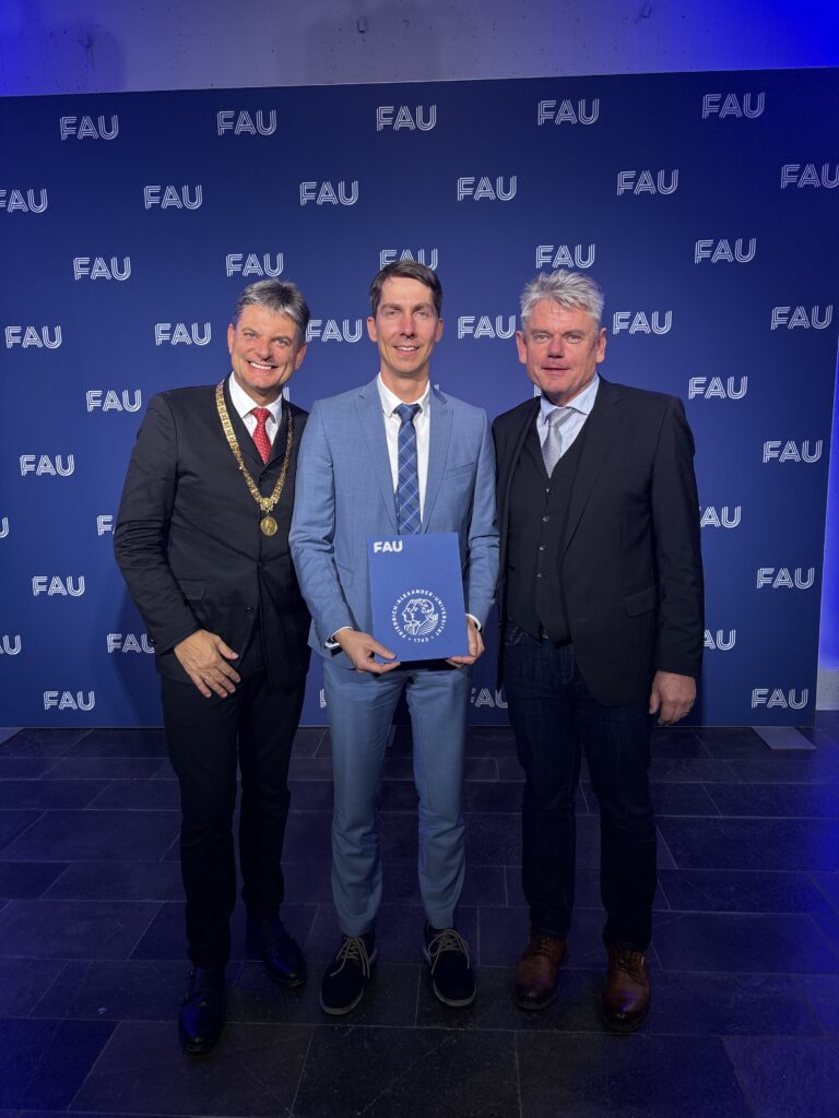 (November 21, 2025) Maximilian Piszko has been awarded the “Promotionspreis der Technischen Fakultät” (Doctoral Prize of the Faculty of Engineering) of FAU 2025. He has received it during the Day of the Faculty of Engineering and presented his work entitled “Dynamic Light Scattering for Simultaneous Determination of Thermal and Mutual Diffusivities of Fluid Mixtures” within a Science Slam. Congratulations! The photo below shows Maximilian with Prof. Michael Wensing and Prof. Marc Stamming after receiving the certificate.