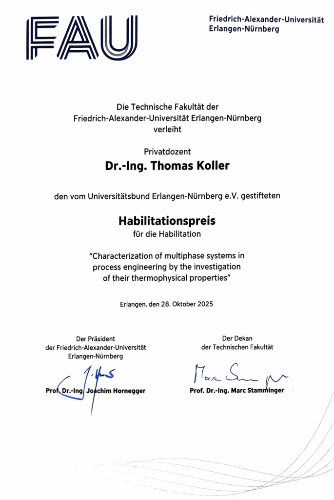 - Thomas M. Koller was presented the Habilitation Award of the Faculty of Engineering of FAU and appointed full professor and Head of the Institute of Thermodynamics of TU Braunschweig.