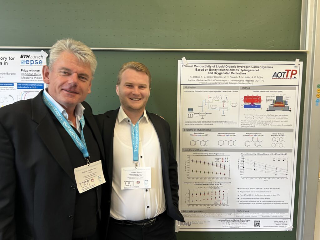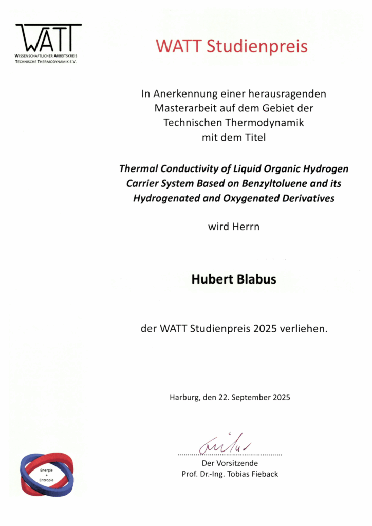 - The Studienpreis 2025 of WATT e.V. for excellent student theses in the field of engineering thermodynamics was awarded to Hubert P. Blabus in connection with his Master thesis entitled “Thermal Conductivity of Liquid Organic Hydrogen Carrier Systems Based on Benzyltoluene and its Hydrogenated and Oxygenated Derivatives”.