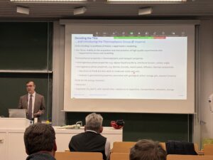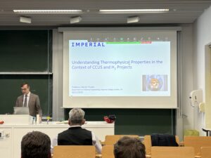 (November 20, 2025) Prof. Martin Trusler from Imperial College London, who is affiliated with the Archimedes Research Unit, has been invited by Andreas Paul Fröba to give a lecture entitled “Understanding Physical Properties in the Context of CCUS and H2 Projects” at the Colloquium of the Department of Chemical and Bioengineering (CBI). Martin Trusler has also spend some time at AOT-TP for supporting the installation of a vibrating wire viscometer. Some impressions from Martin’s talk are given below.